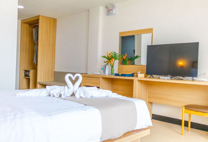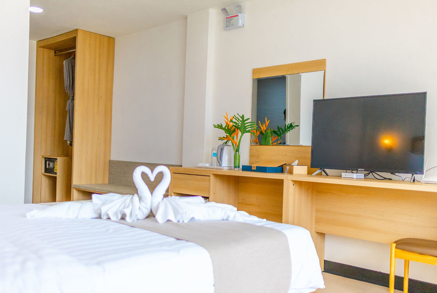 객실 편의시설 : 에어컨, 책상, 냉장고, 발코니, 전용 욕실, TV, 수건, 안전 금고